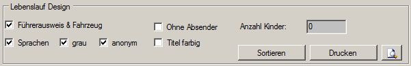 Im Fussteil können Sie mit folgenden Einstellungen das Design bestimmen und den Lebenslauf drucken: