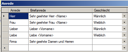 Mittels Doppelklick im Feld 'Anrede' können Sie selber die gewünschten Anreden definieren.