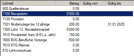 Erfassen Sie folgende Lohnarten, welche Sie benötigen und bestimmen Sie, wenn nötig die Gültigkeitsperiode.