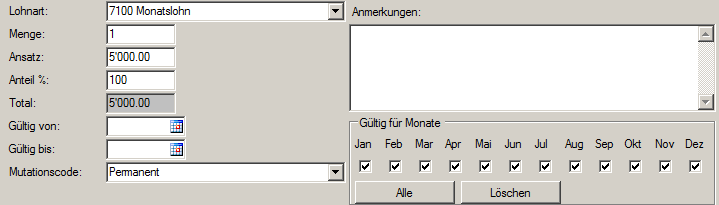 Bei Lohnarten welche nur an bestimmten Monaten ausbezahlt werden (wie z. Bsp. '13. Monatslohn') wird im Bereich 'Gültig für Monate' nur der entsprechende Monat aktiviert.