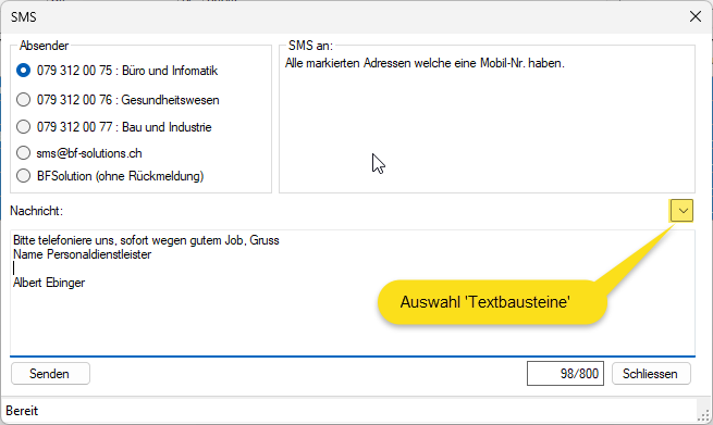 einen Textbaustein oder erfassen Sie den SMS Text.