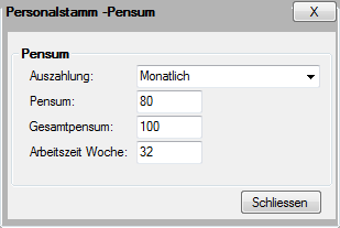 Wenn eine 'Arbeitszeit Woche' (z.B. 32 Std.), ein 'Pensum' (z.B. 80%) und 'Gesamtpensum' (z.B. 100%) festgelegt wird, jedoch keine Periode besteht, erfolgt die Berechnung des SB QS-Betrags auf Basis folgenden Faktoren: