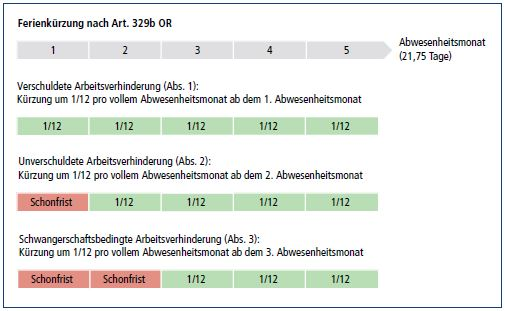 Bei einer schwangerschaftsbedingten Arbeitsverhinderung ist eine absolute Schonfrist für zwei volle Abwesenheitsmonate vorgesehen, d.h., diese bleiben bei der Kürzung unberücksichtigt. Die Arbeitgeberin darf die Ferien somit erst ab dem dritten vollen Abwesenheitsmonat um einen Zwölftel kürzen, und danach ist eine Kürzung von einem Zwölftel für jeden vollen Abwesenheitsmonat zulässig (Art. 329b Abs. 3 OR).