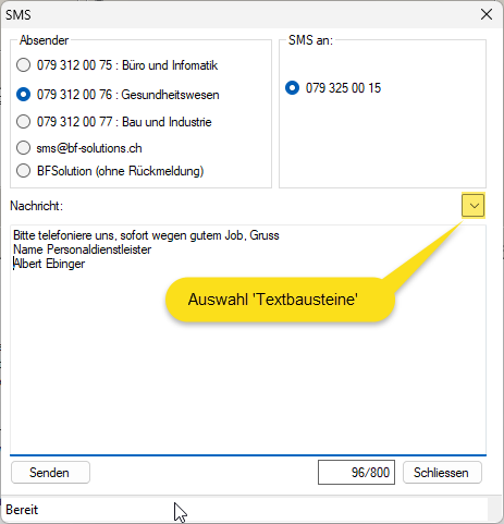 Mittels Schaltfläche können Sie SMS-Textbausteine (welche Sie mutieren können) übernehmen.
