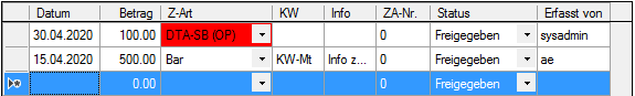 DTA-SB, welche noch nicht überwiesen wurden, werden in der Spalte 'Z-Art' rot markiert und mit der Bezeichnung (OP) angezeigt und können von Benutzer mit Berechtigung 'Administrator' gelöscht werden.