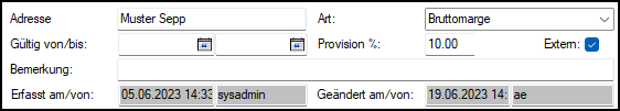 Extern Aktivieren Sie dieses Flag bei allen externen Provisonsberechtigten. Wenn die provisonsberechtigte Person intern angestellt ist, muss dieses Flag deaktiviert sein.