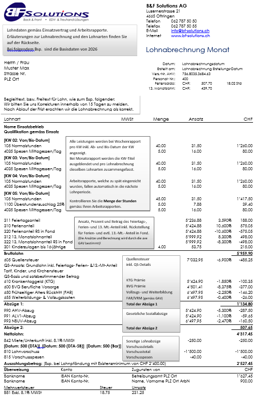 Gemäss dem GAV Personalverleih muss auf jeder Lohnabrechnung der Einsatzbetrieb und die Qualifikation gemäss GAV-Abfrage enthalten sein.