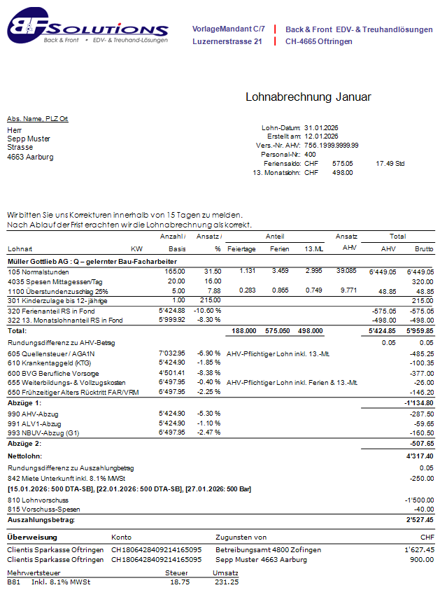 Zwischen Nettolohn und Auszahlungsbetrag werden alle Bezüge, und sonstige Abzüge aufgeführt: