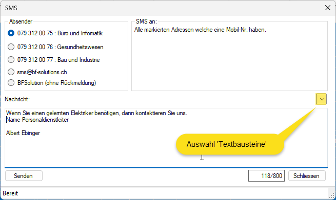 einen Textbaustein oder erfassen Sie den SMS Text.