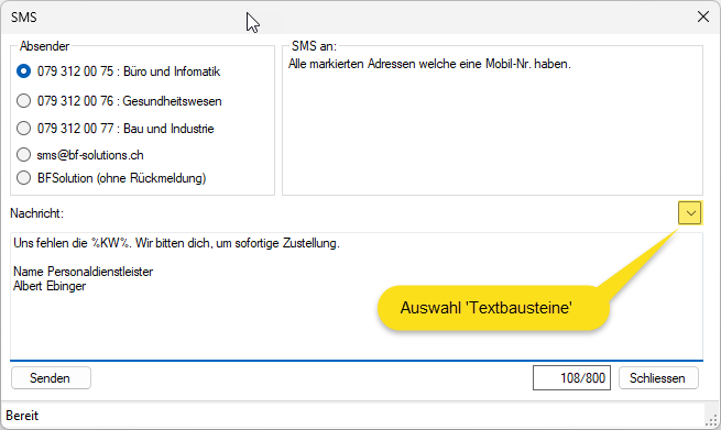 6. Mittels Schaltfläche [Senden] wird der Versand der SMS gestartet.