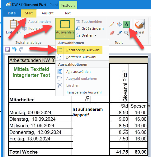Mittels Icon kann der Rapport (im gemäss Kapitel 'Standard-Apps festlegen' bestimmten Bildbearbeitungsprogramm) geöffnet werden, um die unten beschriebenen Bildbearbeitungen im 'Paint' vorzunehmen.