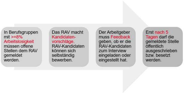 Bei der Stellenmeldung erhält der Arbeitgeber eine Bestätigung, dass er gemeldet hat. Diese Bestätigung ist Grundlage für das spätere Kontrollverfahren. Nach der Meldung prüft das RAV die Meldung auf Vollständigkeit. Wenn diese Prüfung erfolgt ist, schaltet das RAV die gemeldete Stelle im Job-Room auf. Die 5-tägige Sperrfrist beginnt ab dem Folgetag der Aufschaltung zu laufen, die dem Arbeitgeber ebenfalls bestätigt wird. Insgesamt kann die effektive Sperrfrist ab Meldung somit ca. 6-7 Arbeitstage dauern.