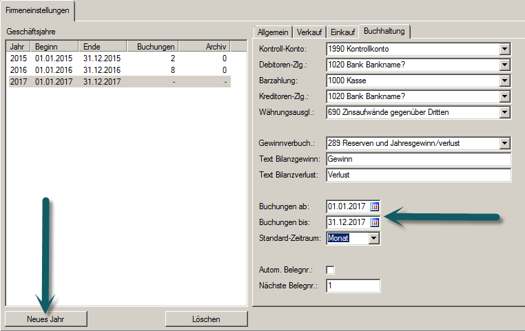 Nun muss noch im Register [Buchhaltung] das Datum 'Buchungen ab/bis' erfasst werden.