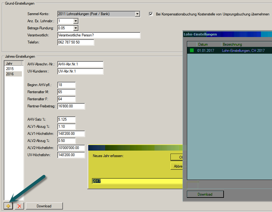 Im (grün markierten) Dialogfenster 'Lohn-Einstellungen' mittels Schaltfläche [Download] die aktuellen gesetzlichen Sozialleistungen herunterladen.