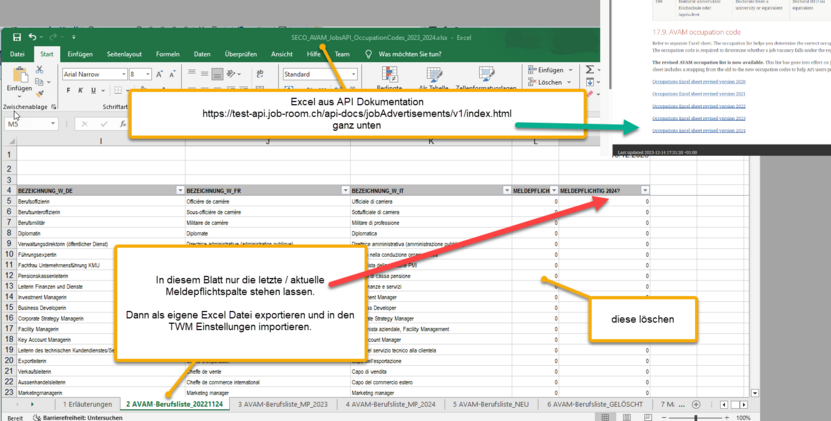 In der Dokumentation der API-Schnittstelle unter https://test-api.job-room.ch/api-docs/jobAdvertisements/v1/index.html, kann mittels dem Link unter dem Kapitel 'Latest change:' die Excel-Datei mit den aktuellen meldepflichtigen sowie nicht-meldepflichtigen Berufsbezeichnungen heruntergeladen werden.