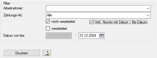 Akontos mit Datum nach dem gewählten Bis-Datum und einem Lohn-Datum vor dem gewählten Bis-Datum.