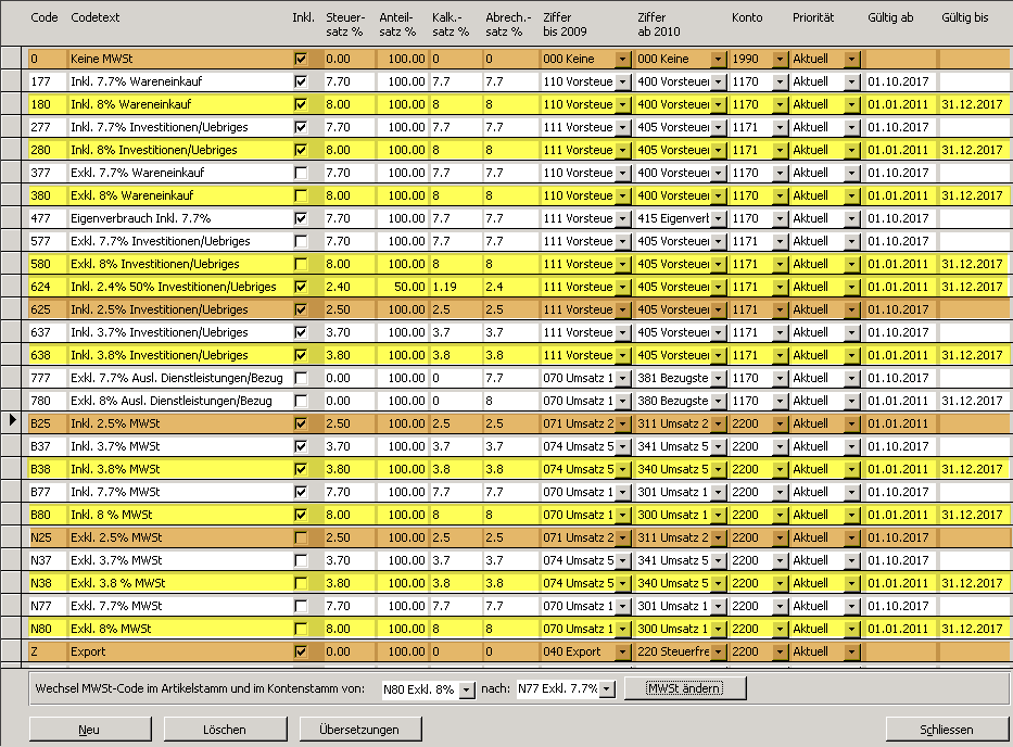 In folgendem PrintScreen finden Sie die alten, mutierten und neuen MWST-Datensätze.