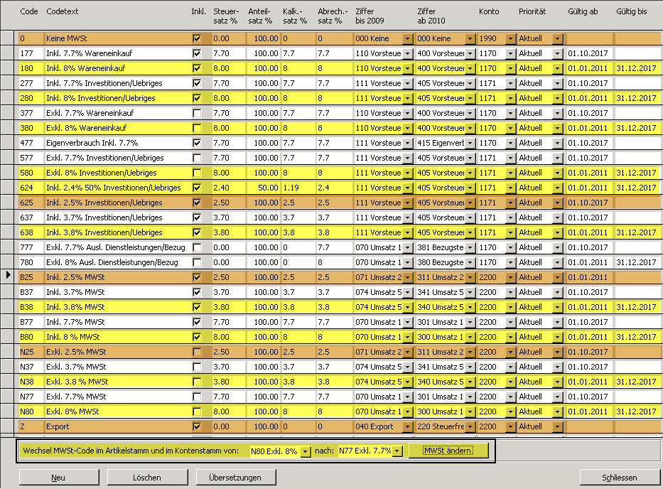 Wechseln Sie anfangs Jahr 2018, sobald Sie alle Rechnungen vom Geschäftsjahr 2017 verrechnet haben, unter Stammdaten > MWST-Code die MWST für den Artikel- und Kontenstamm.