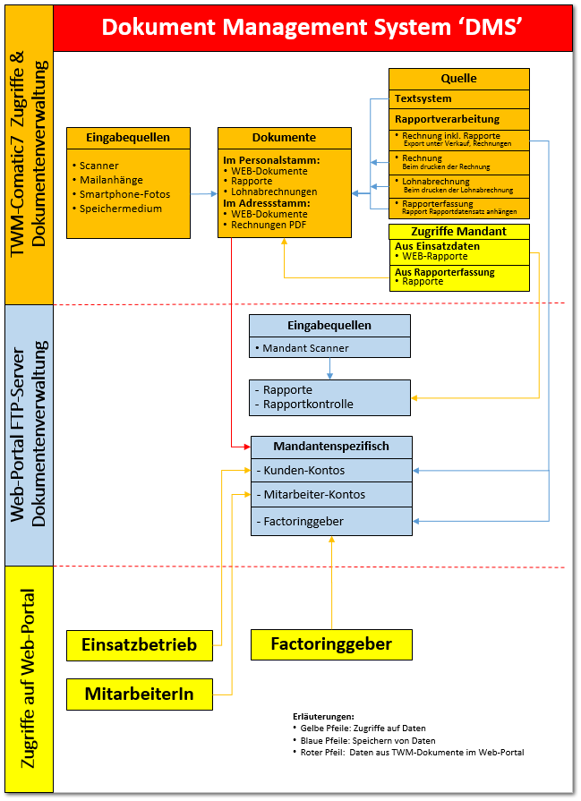 Mittels TWM-Modul 'Web-Portal', können bestimmte Dokumente in einem persönlichen Web-Konto gespeichert werden, auf welche ArbN, Einsatzbetriebe, bzw. Kontaktpersonen und Factoringgeber mit einem Login zugreifen können. Zudem können Rapporte eingescannt werden, auf welche man unter Einsatzdaten mittels Schaltfläche [Web-Rapporte] zugreifen kann um die Rapporterfassung vorzunehmen und einen Rapportdatensatz den Rapport anhängen kann.