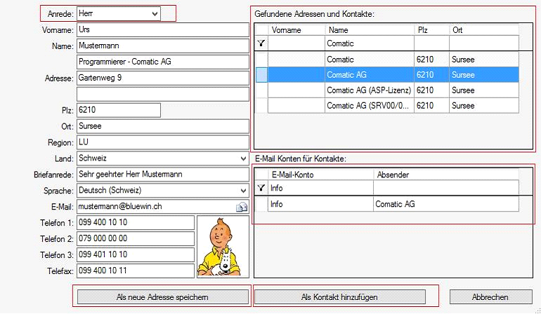 Wenn der Kontakt als Adresse gespeichert werden soll, muss die Anrede ergänzt werden, falls ein Vorname vorhanden ist.