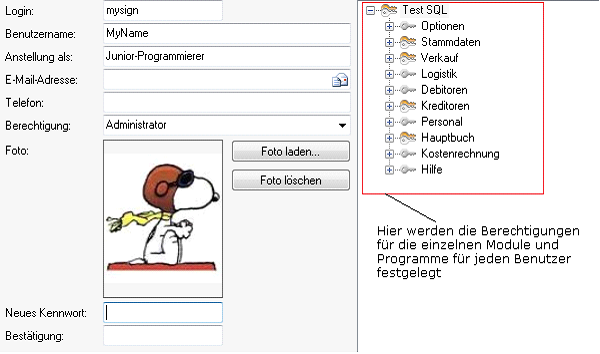 Wählen Sie aus dem Menü 'Optionen' das Programm 'Benutzereinstellungen', um Ihre persönlichen Daten zu erfassen. Sie selbst haben als Administrator immer alle Berechtigungen. Sie können Benutzer hinzufügen, löschen und ändern. Stellen Sie sicher, dass für jeden Benutzer die korrekten Berechtigungen eingestellt sind: