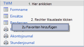 In unserem Beispiel wollen wir dem Menü 'TWM' das Untermenü, bzw. Formular 'Pendenzen' zu den Favoriten hinzufügen.