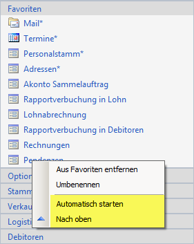 Klicken Sie mit der rechten Maustaste auf den Titel des gewünschten Menüs 'Pendenzen' und bestätigen Sie 'Zu Favoriten hinzufügen'