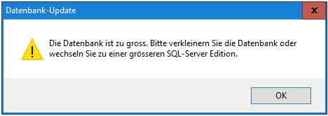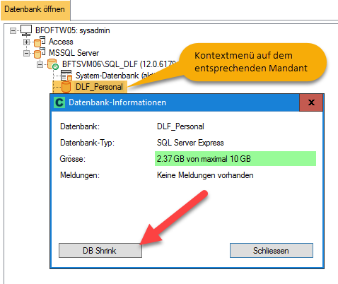 Mittels SQL-Express kann der Mandant geöffnet und mittels Kontextmenü verkleinert werden.