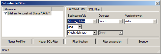 Im folgenden Bsp. wird ein Filter definiert, um damit für das gesamte Personal mit Status = 'Aktiv' ein Brief zu erstellen.