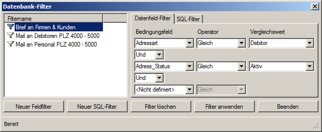 Im folgenden Bsp. wird ein Filter definiert um damit alle Adressen mit Adressart = 'Debitor', welche den Status = 'Aktiv' haben ein Brief zugestellt werden.