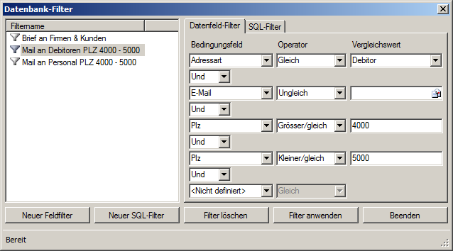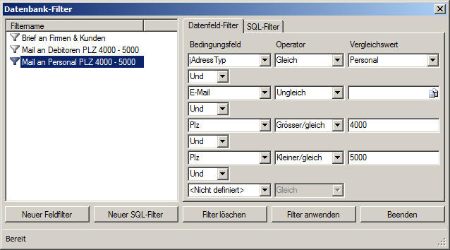 Im folgenden Bsp. wird ein Filter definiert, um damit direkt aus dem Mailprogramm für das gesamte Personal mit E-Mail und PLZ zwischen 4000 und 5000 ein Mail zu senden.