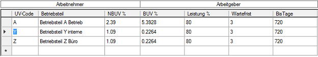 Erfassen Sie in dieser Tabelle die Betriebsteile Ihrer Firma in Bezug auf die Unfallversicherung. Die definierten Codes können den Mitarbeitenden zugeteilt werden.
