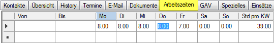Im Register [Arbeitszeiten] können die täglichen Arbeitsstunden verwaltet werden.