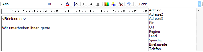 Die Texte können formatiert und mit Platzhalter (Dropdown bei Feld) ergänzt werden.