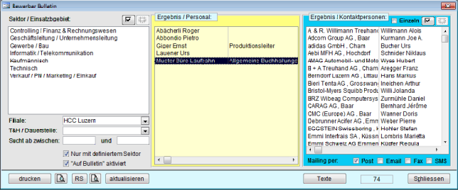 Welche Bewerber in welchem Bulletin enthalten sind, wird durch die Zuweisung im Personalstamm, Register [Stellensuche], [Allgemeine Infos] bestimmt.